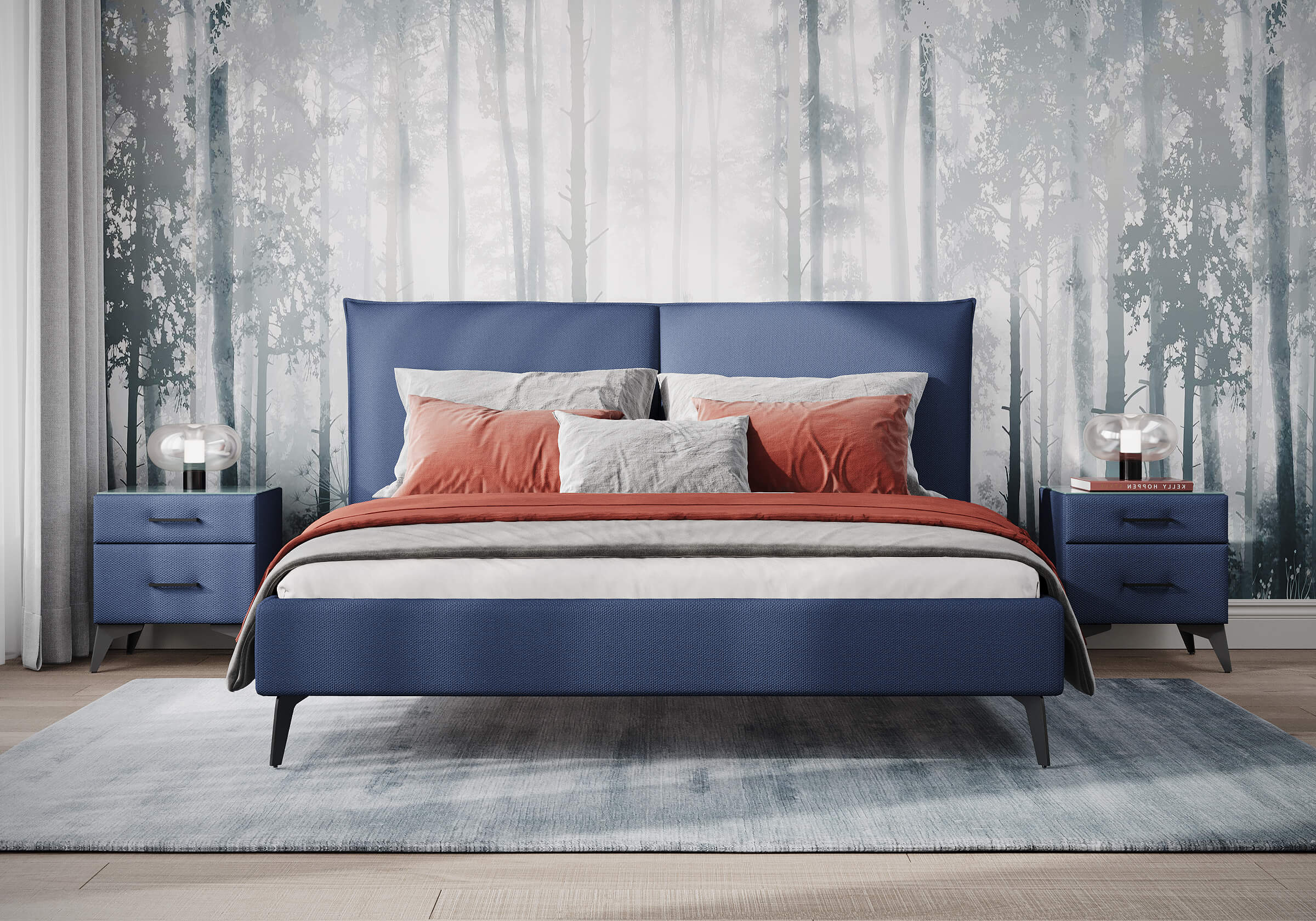 Кровать с мягким изголовьем в виде больших подушек, которые придают спальне особую атмосферу комфорта и уюта. Сзади данная модель полностью обита мебельной тканью, что сохраняет целостность образа и позволяет поставить кровать в центр комнаты. Высокие металлические опоры создают ощущение легкости и изящности, облегчая поддержание чистоты, что делает изделие практичным для повседневного использования.